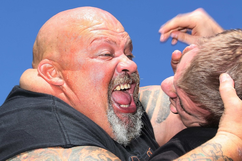 「溝口・ヌメリトリ」というお風呂用洗剤のCMキャラクターに成り切っているプロレスラー |